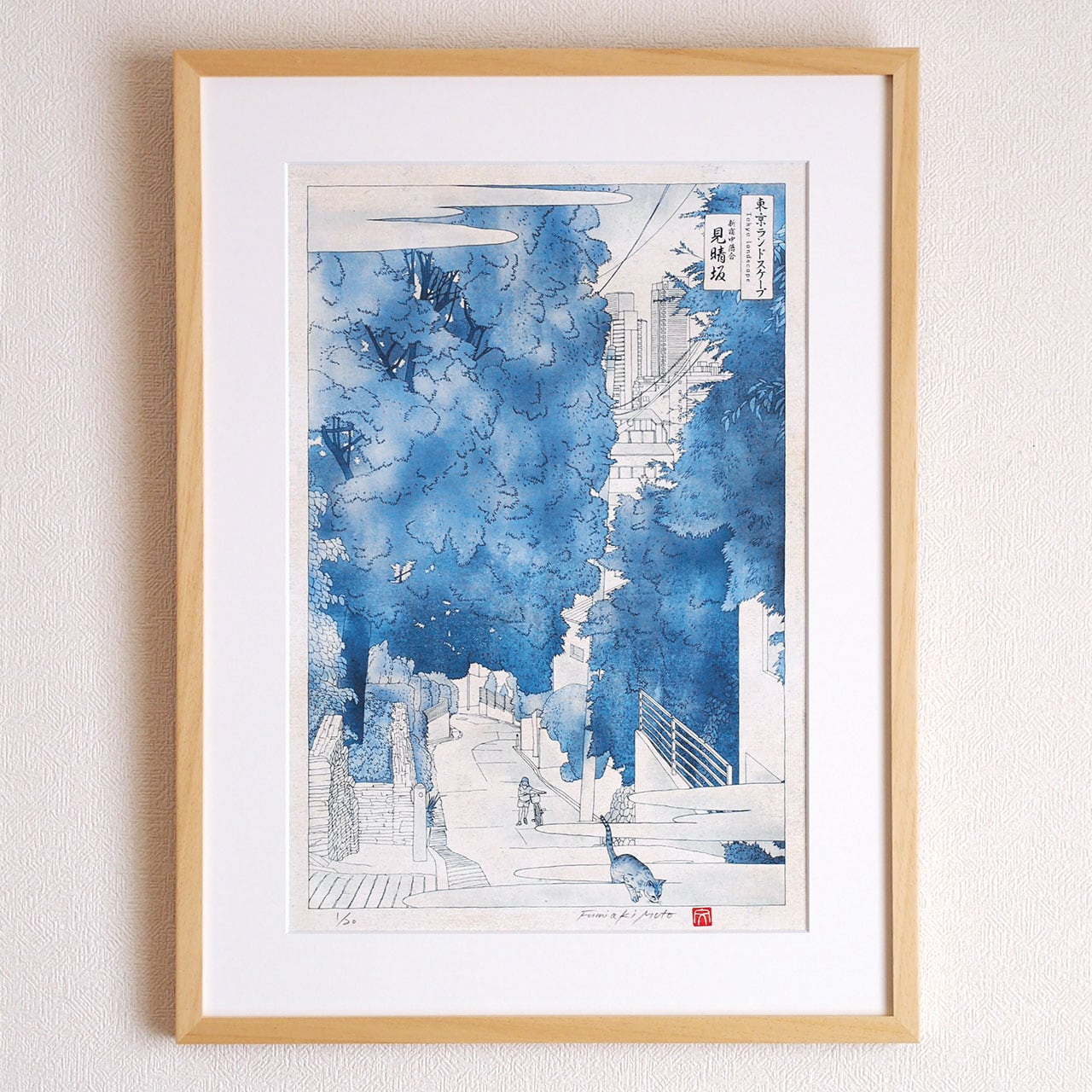 坂の多い東京で、ふと猫が通りがかる日常のひとコマを描きました。